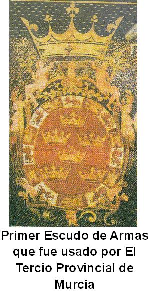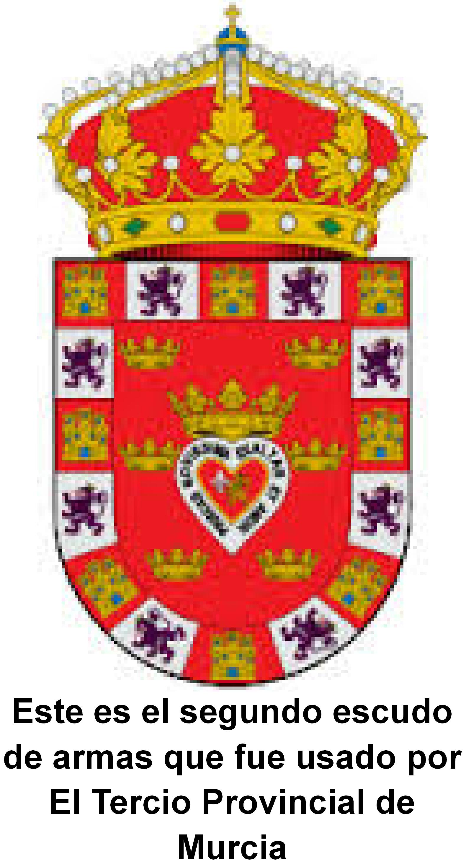 El primer escudo de armas del recién creado Tercio Provincial de Murcia fue el que se da a conocer en este diseño que pertenece al año 1575, cuando todavía no se le había concedido a la histórica ciudad de Murcia la séptima corona de oro, ni se había incorporado en su centro el corazón del rey Alfonso X, pues, como antes hemos dicho, el año de su creación fue el 1694 y la séptima corona no le fue concedida a Murcia hasta el año 1707.